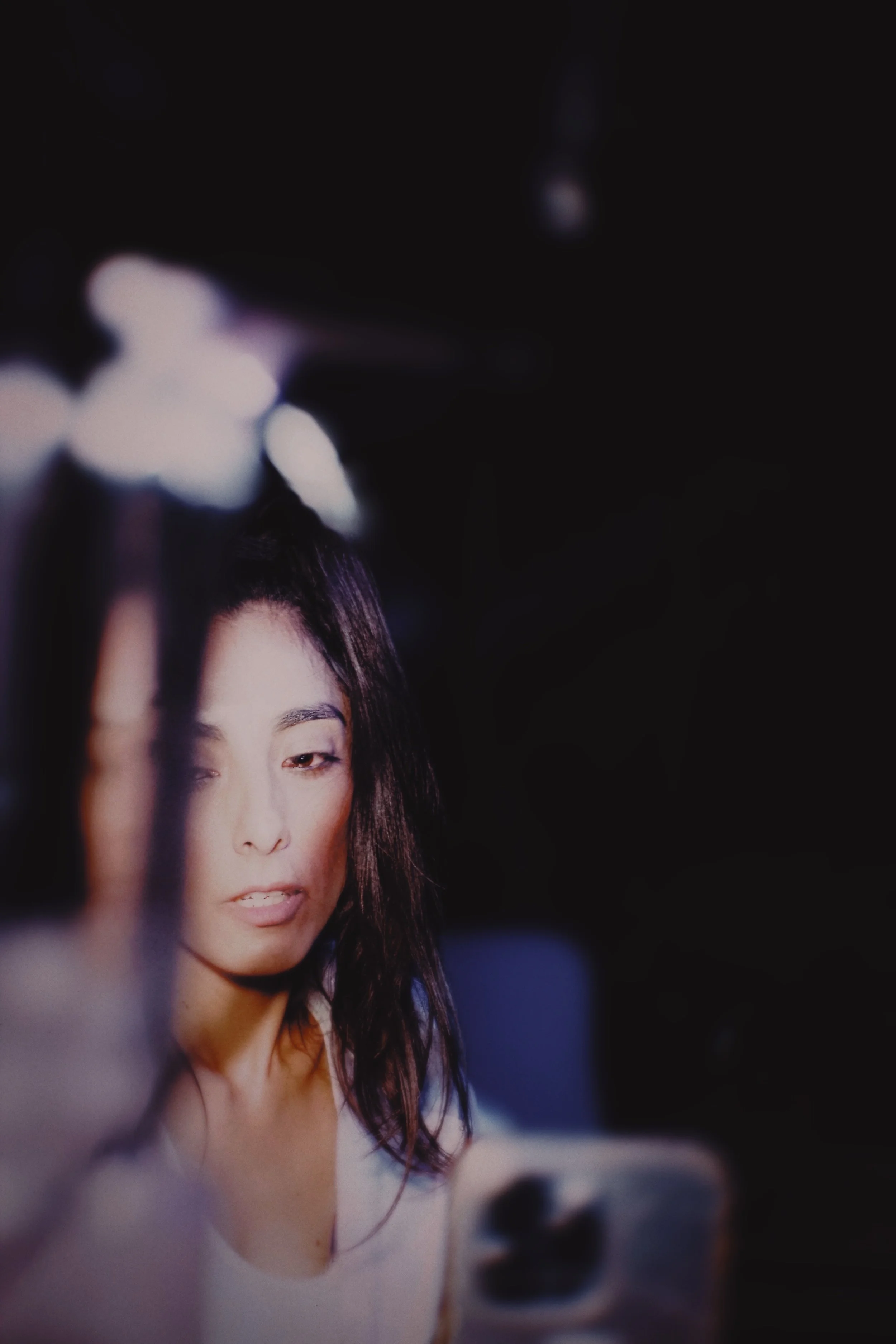 A woman taking a selfie with her phone, partially obscured by a blurry object in the foreground, against a dark background.