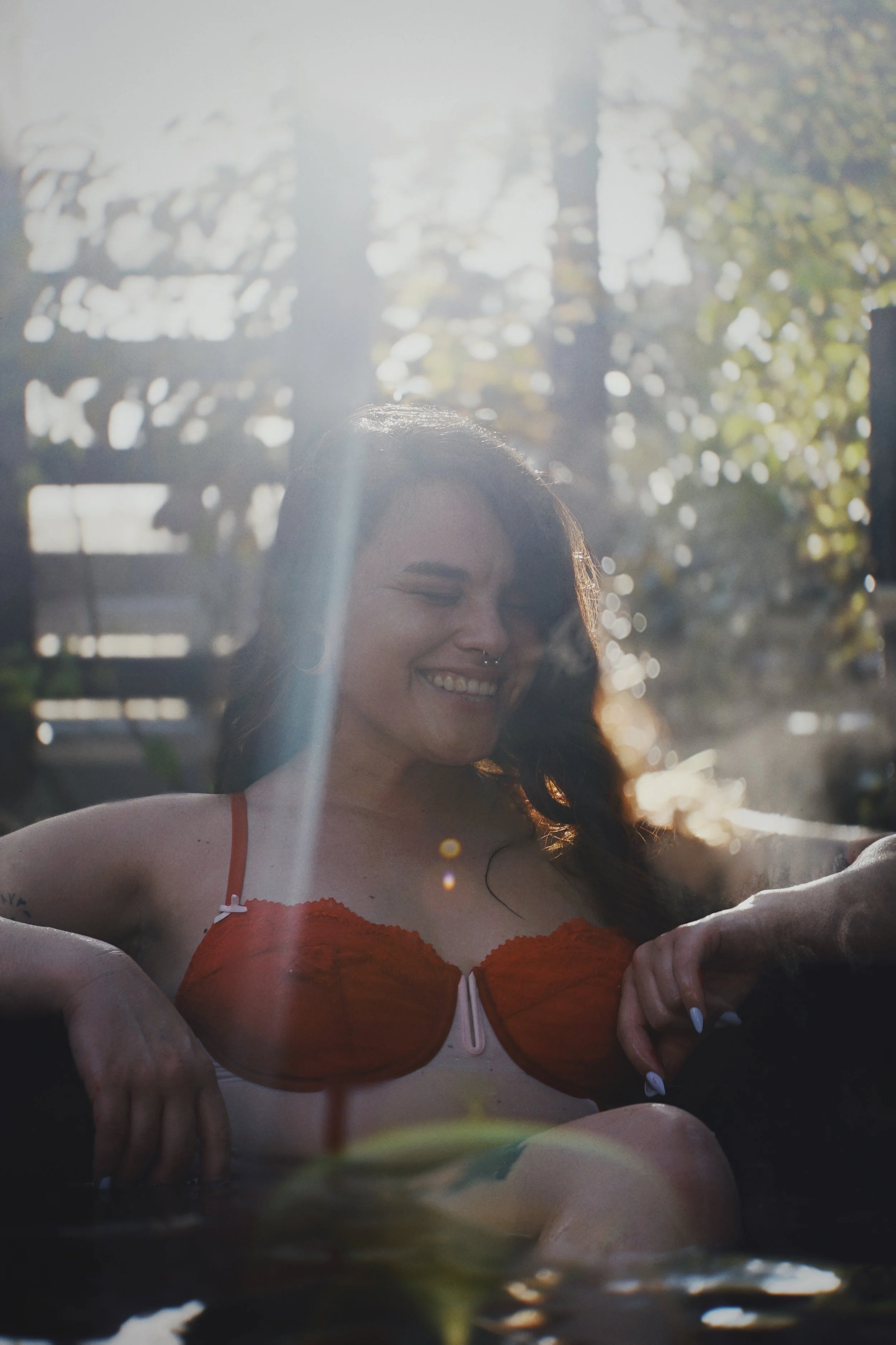A woman with long dark hair, wearing a red bikini, smiling while sitting in water with sunlight and trees in the background.